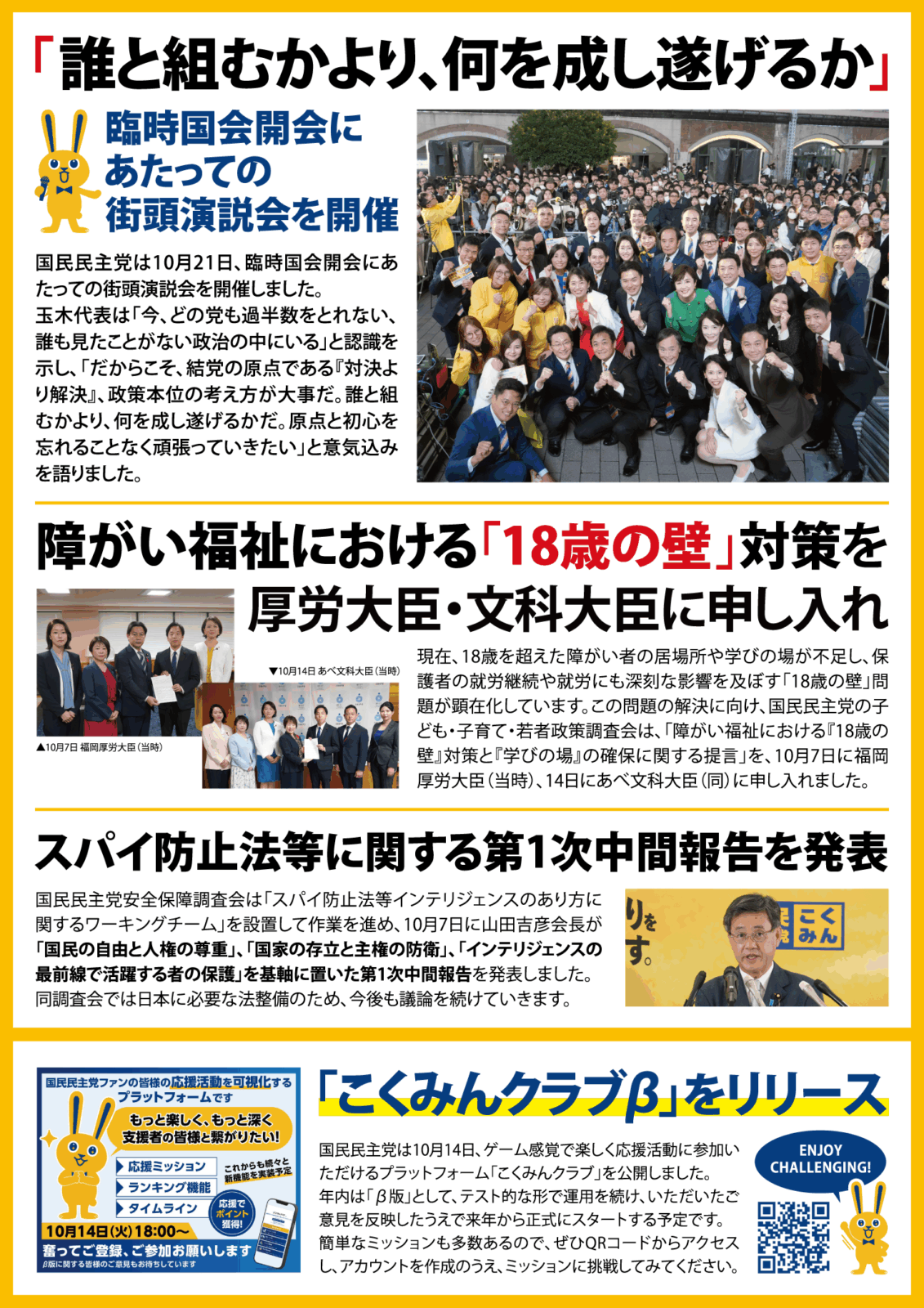 【国民民主PRESS・号外】-令和7年10月31日発行版- 2025年11月4日 #国民民主党ポスティングボランティア国民民主PRESS号外 国民民主PRESS・号外「年少扶養控除復活法案提出」版(令和7年10月31日)を発行しました。A4サイズの両面デザインとなります。 ※ボランティアでビラを配布する際は、形式を変更せずそのまま印刷してご使用ください。 ※号外ビラは日常的な政治活動にお使いいただけますが、配布される際は建物や私有地のルールの遵守をお願い致します。 引き続き、国民民主党をよろしくお願い致します。